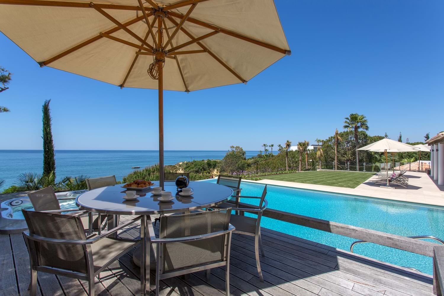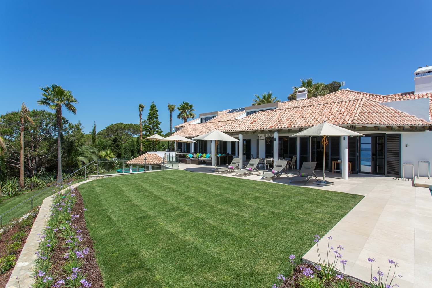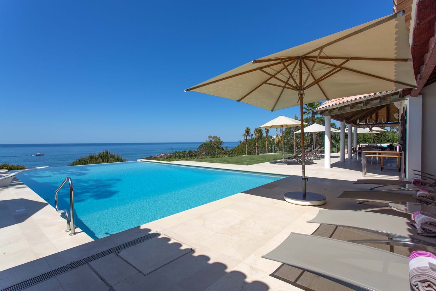 An unrivalled range of fine facilities includes a gym, an infinity pool surrounded by furnished sun terraces, and a poolside Jacuzzi and bar overlooking the sea. The sitting room is spacious, cool and contemporary, and each of the five bedrooms has a bathroom or shower room en suite. Cook service is included here for breakfast and lunch and for four-seasons comfort, the Villa has central heating, pool heating and a games room looking out to sea. Deservedly popular, the villa is within walking distance of two beach restaurants and 1 km to the well known Villa Joya michelin star restaurant as well as shops, restaurants, and sports on land and sea.