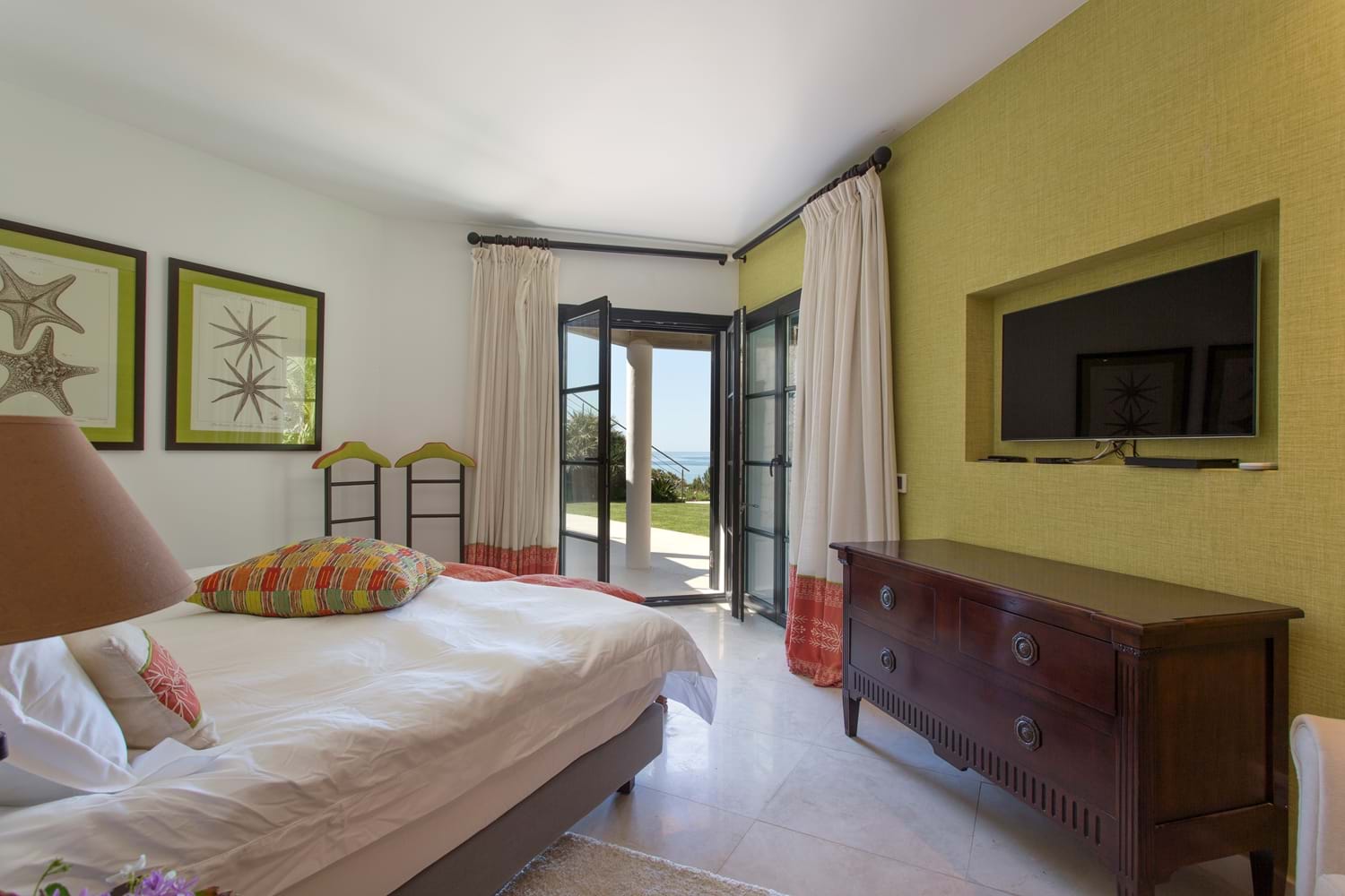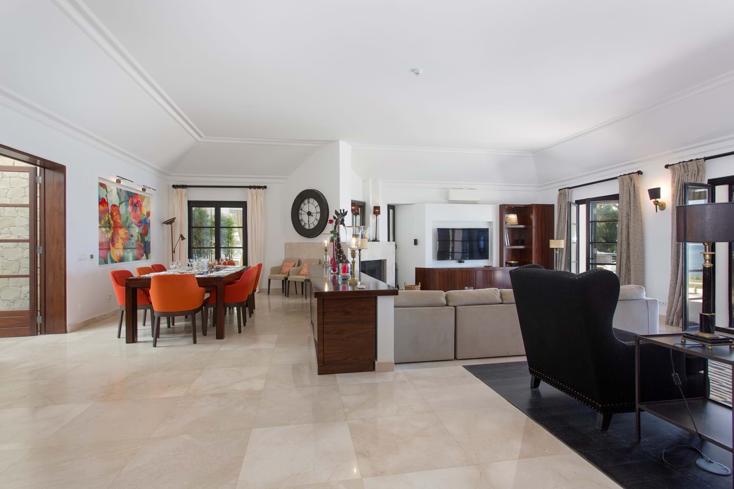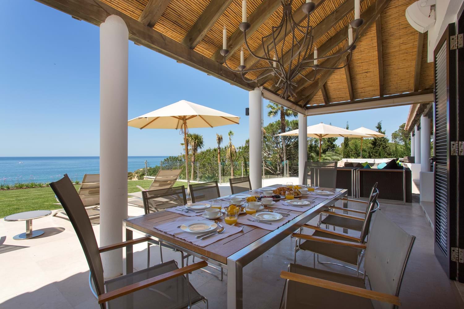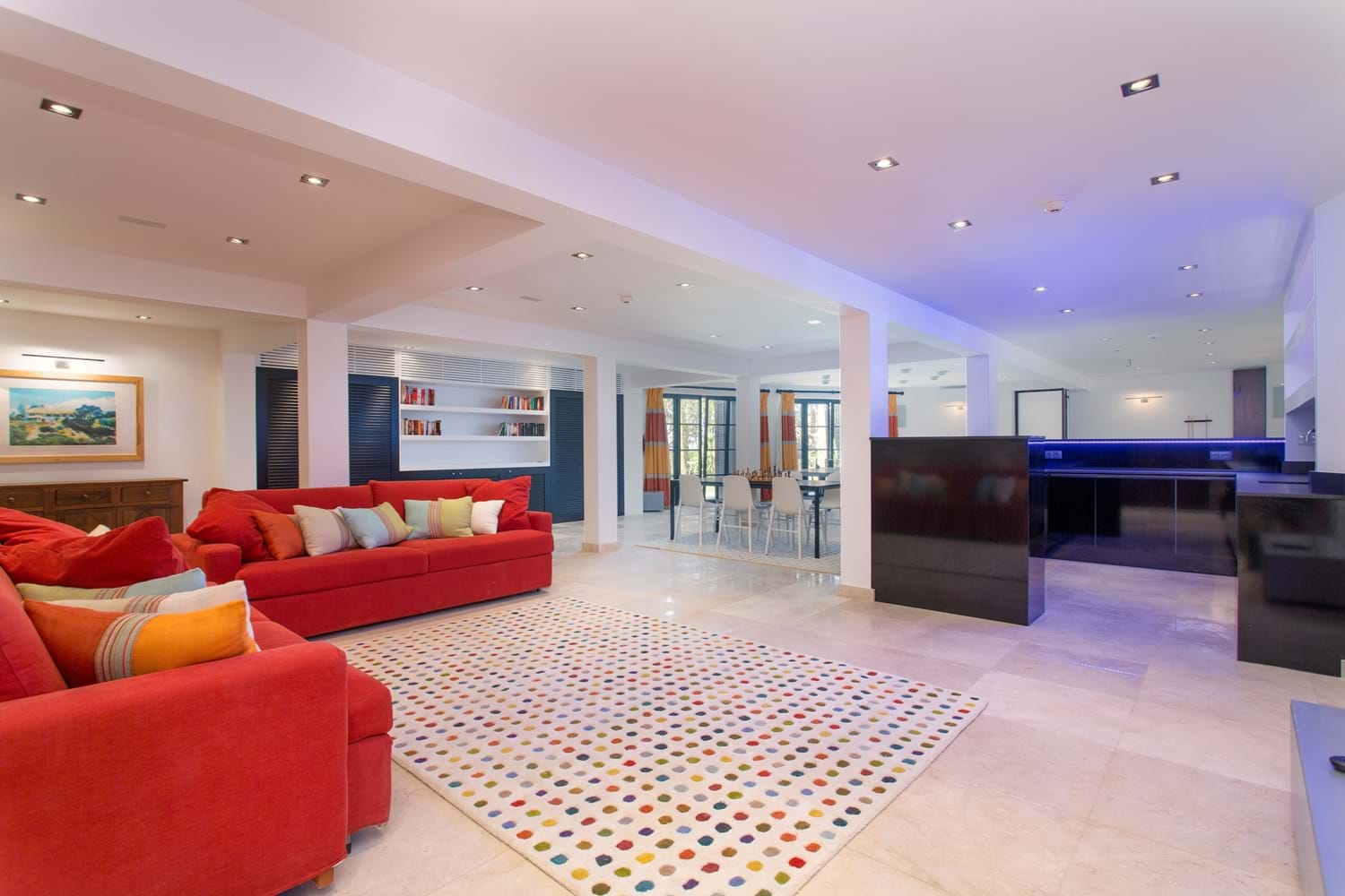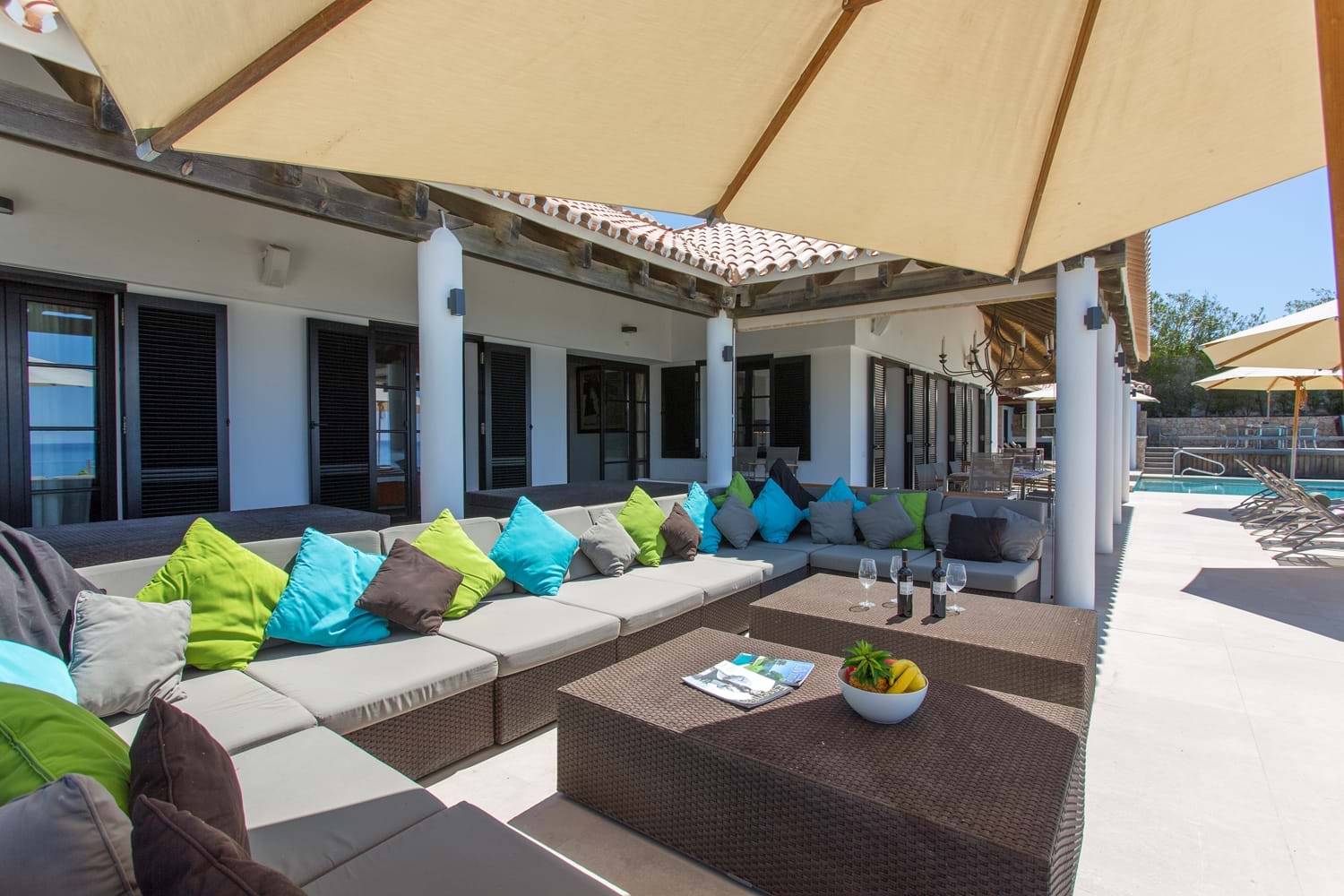 Perfectly perched above a semi-private sandy beach, with sweeping lawns leading down toward the sea, this magnificent property which has undergone a substantial interior refurbishment over the last two years, offers an enviable level of luxury that leaves nothing to chance. With equal emphasis on style and comfort, the interior décor with Asian touches and interesting pais softened with subtle natural shades and warmed with rich reds, while outdoor sofas on an open terrace are infused with summer colours in bright cushions.The living room has dark colonial coloured terrace doors with a flair of Italian design found also in the dining room.Soft beige colours are accompanied by colourful cushions creating a warm and comfortable atmosphere.