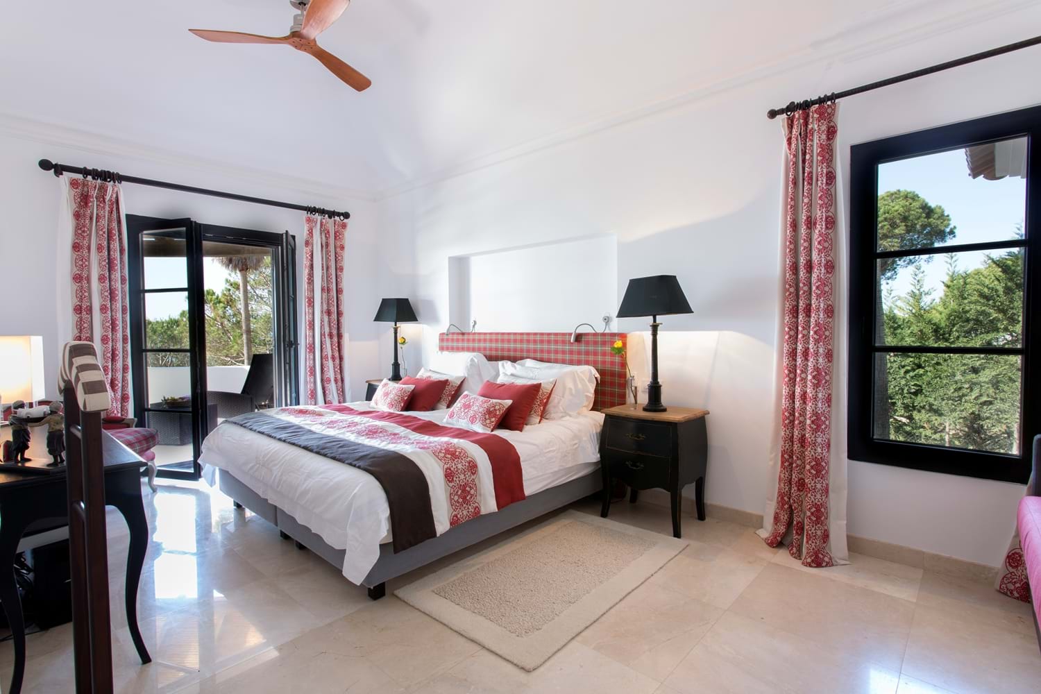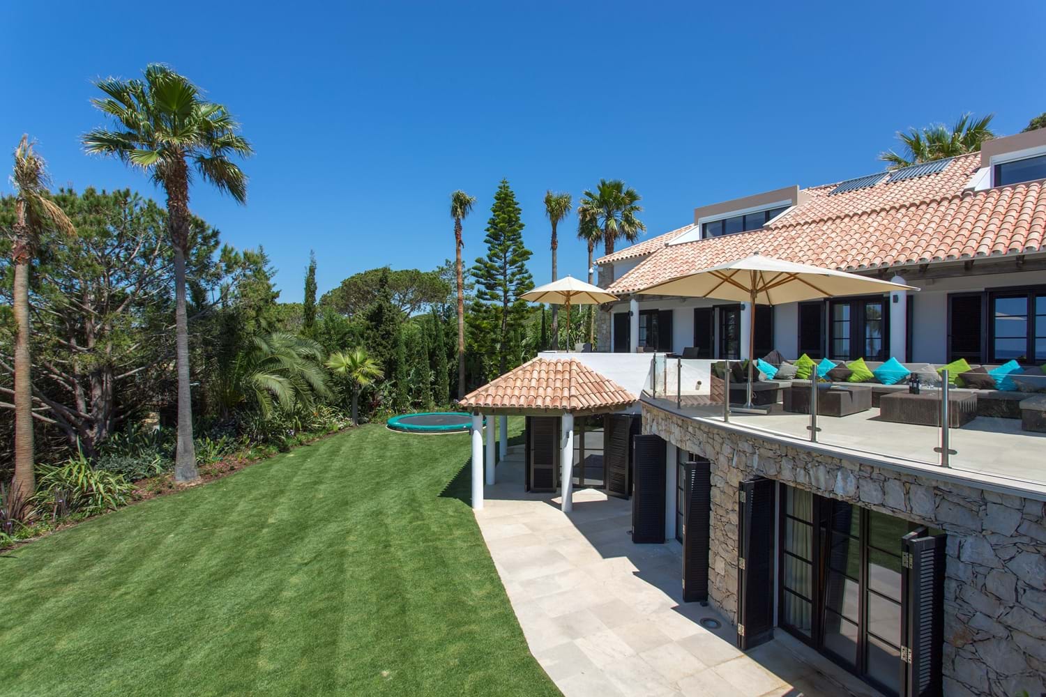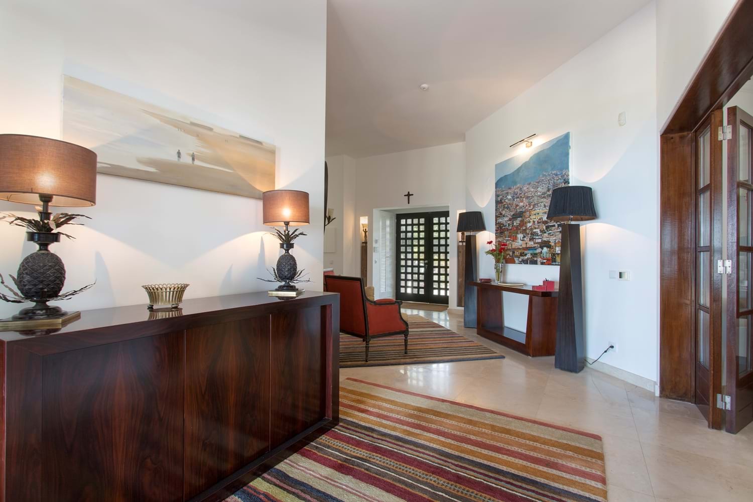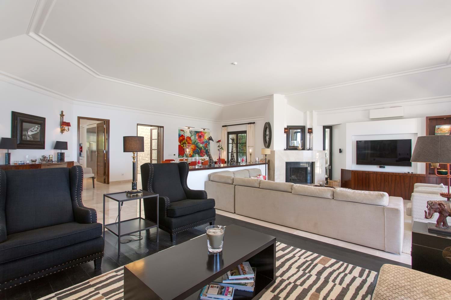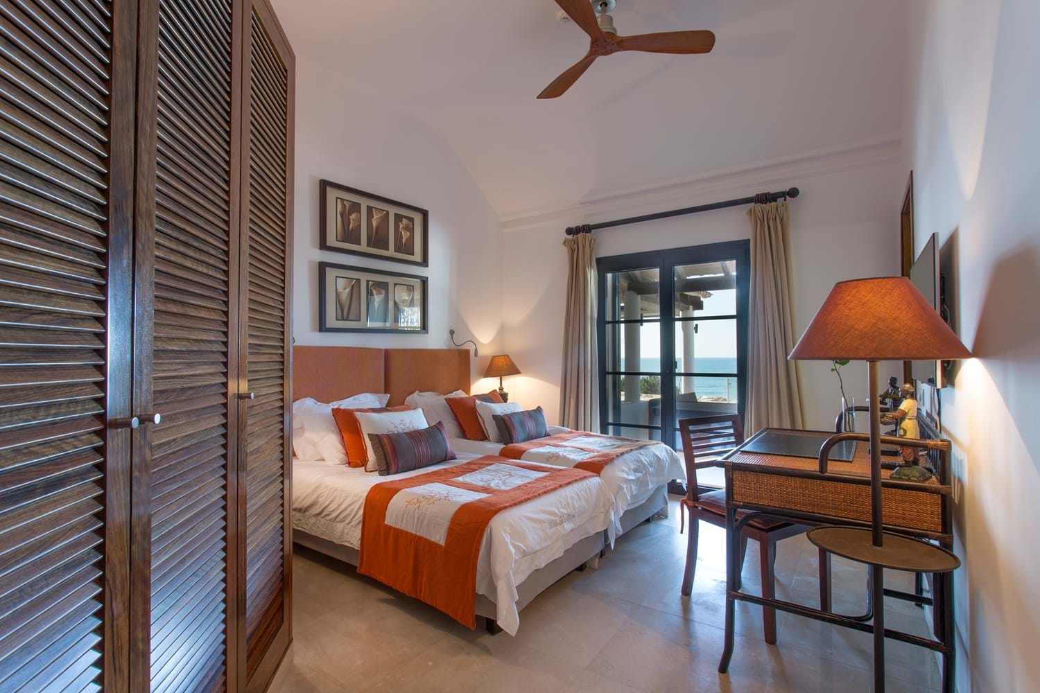 Perfectly perched above a semi-private sandy beach, with sweeping lawns leading down toward the sea, this magnificent property which has undergone a substantial interior refurbishment over the last two years, offers an enviable level of luxury that leaves nothing to chance. With equal emphasis on style and comfort, the interior décor with Asian touches and interesting pais softened with subtle natural shades and warmed with rich reds, while outdoor sofas on an open terrace are infused with summer colours in bright cushions.The living room has dark colonial coloured terrace doors with a flair of Italian design found also in the dining room.Soft beige colours are accompanied by colourful cushions creating a warm and comfortable atmosphere.